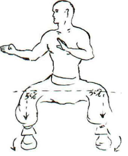 No Kung Fu Shaolin, sabemos que as 3 posturas principais são: Cavalo, Arqueiro e postura do Gato. Abaixo estão os desenhos feitos pelo Bruce Lee mostrando a porcentagem de peso realizado para cada perna.
